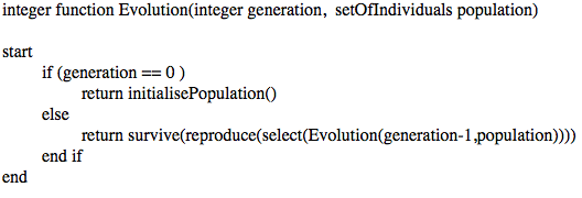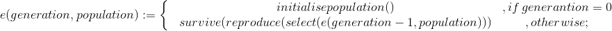 gen = survive(experience(reproduction(select(gen-1)))) (4)