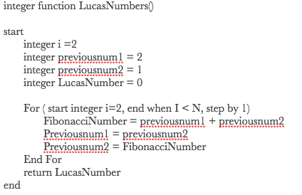 - A for loop constantly increments a the value of a variable with a constant until it reaches a limit; if this constant is negative then the values decrease towards their values. In the implementation of the LucasNumber function, a for loop starts with an initial value of 2, then increases the value of i by 1, until it is equal to the value of the constant N.