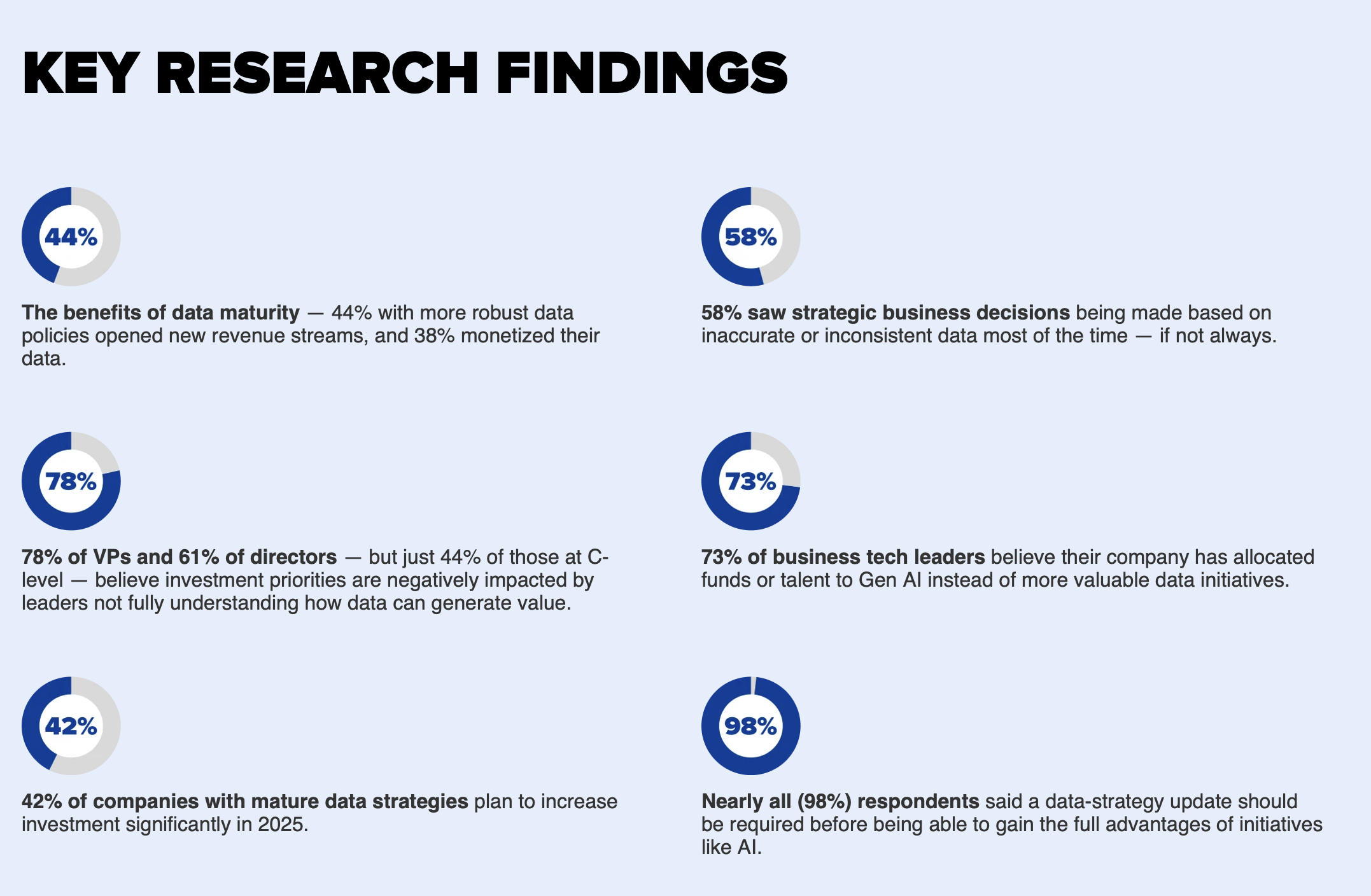 We are experiencing a significant gap between business leaders’ ambitious goals. The actual use of data is not meeting those aims[1]. Recent key findings from the industry highlight gen-AI may not be as valuable as anticipated. Data strategies are not meeting the needs of gen-AI. Other forms of AI are also affected.